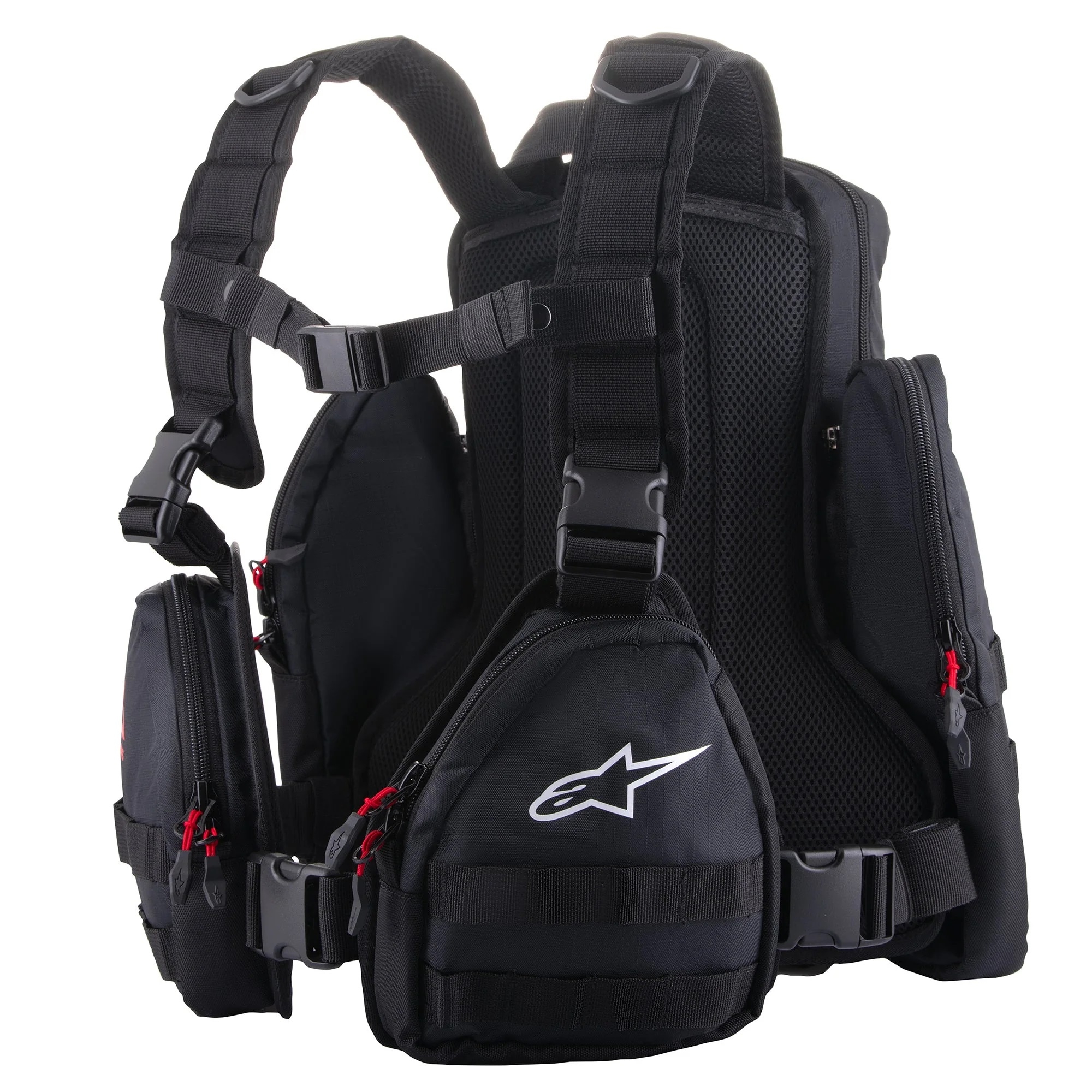 • Ergonomic shoulder straps with perforated foam padding and mesh panels for an optimised airflow, adjustable and removable chest strap and the Alpinestars' magnetic chest buckle for a fast and secure adjustment.