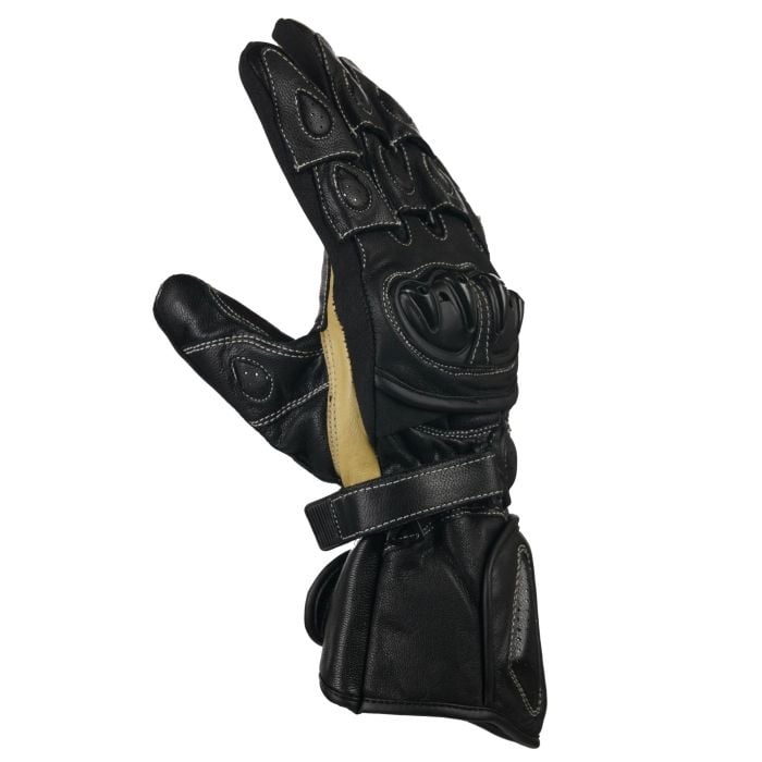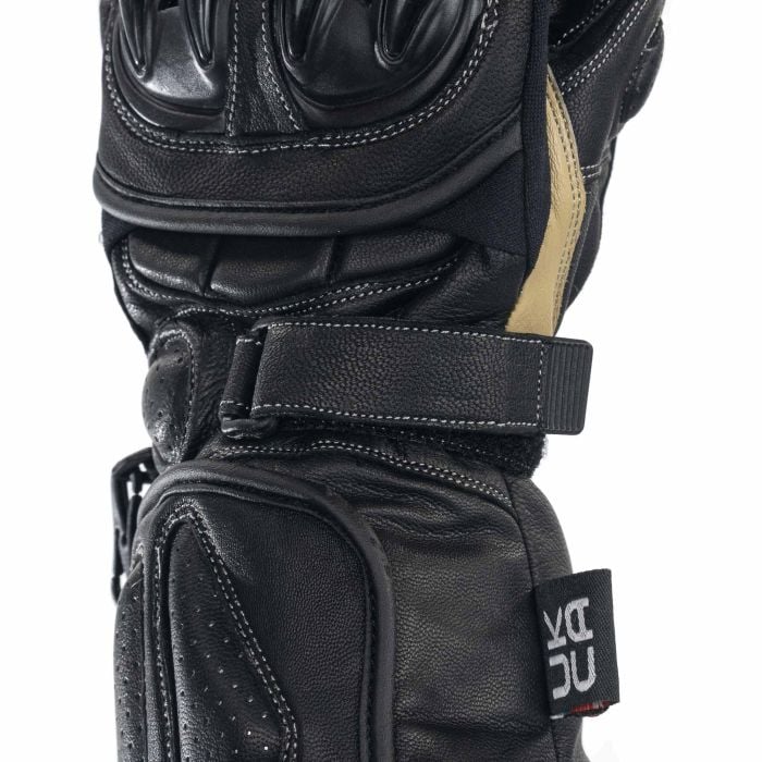 With its sleek, stylish and modern aesthetic, The lightweight black leather, that’s exceptionally supple, gives the glove its comfort and core strength. The glove is further enhanced with specifically placed knuckle and palm armour offering protection and ventilation where it’s most needed. Kangaroo hide was chosen for the palm side of the glove, for its superior strength and enhanced finger feel, crucial for optimum bike, brake and throttle control under all conditions. An armoured wrist section finishes the gloves, designed to go over the top of your jacket offers extra support and cushioning should the worst happen. An easy to use (even with gloves on) velcro closure helps finetune for a perfect fit every time.