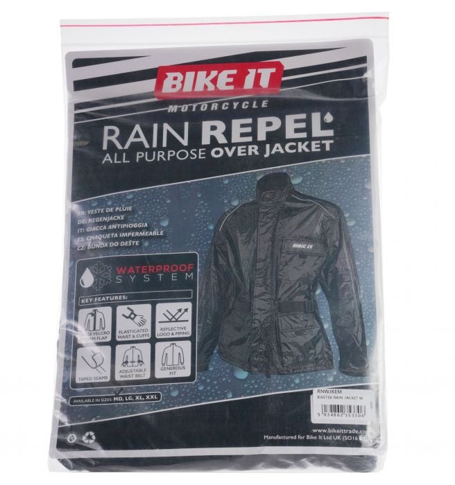 Over-jacket in a generous cut to fit over your normal clothes and keep the rain off on your journey. Jumbo main zip with storm flap and Velcro fastening cuffs help keep joins sealed and the weather out while the elasticated waist and cuffs ensure a great fit.