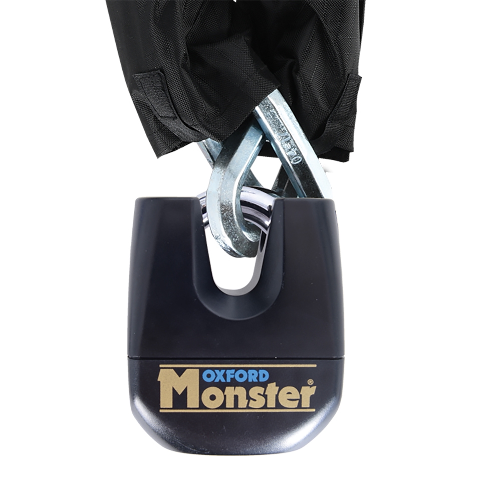 The Oxford Monster Ultra strong padlock has hardened boron steel armour casing, 11mm hardened steel shackle and comes with three keys.